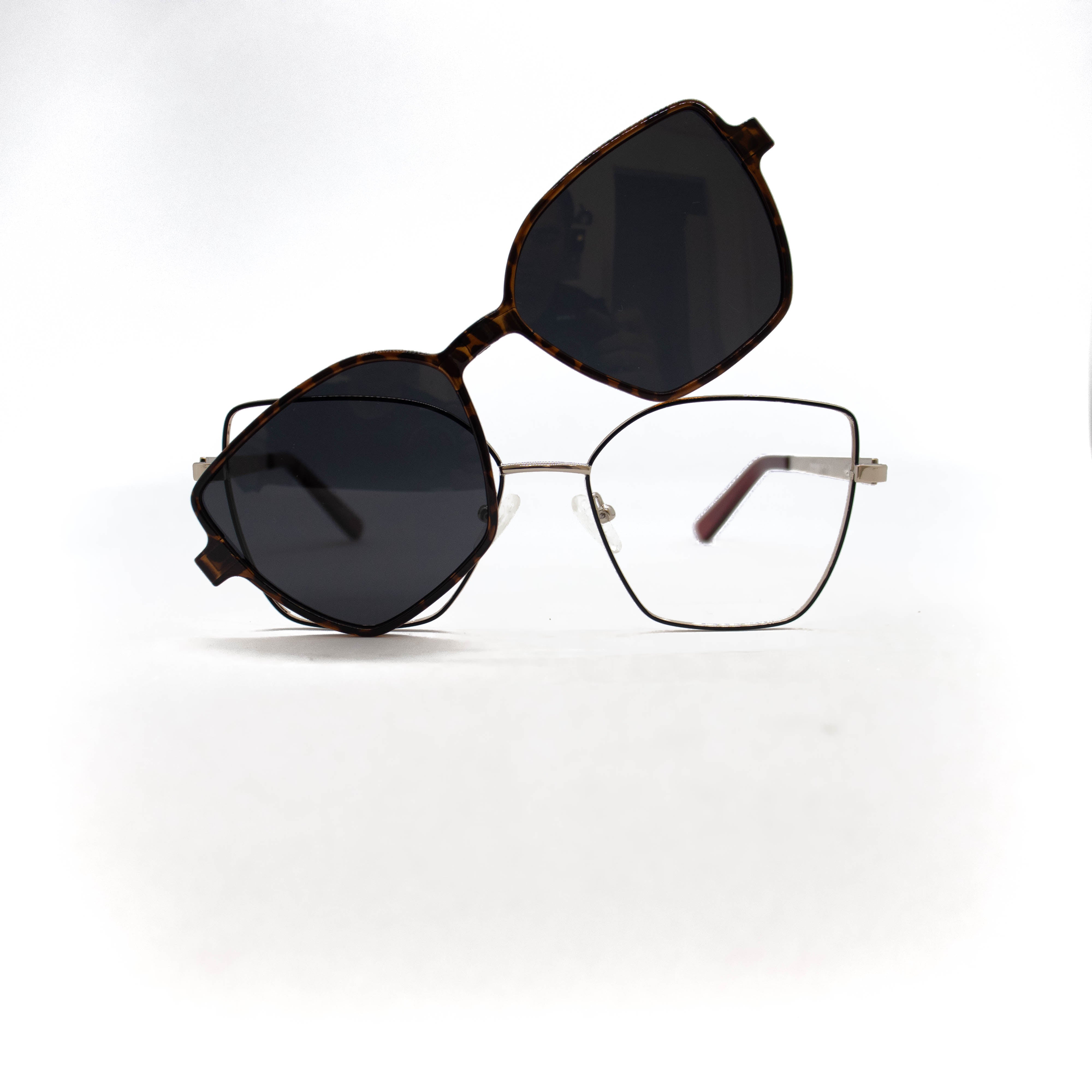 Armação de óculos de grau e de sol fechado em armação no material de metal.