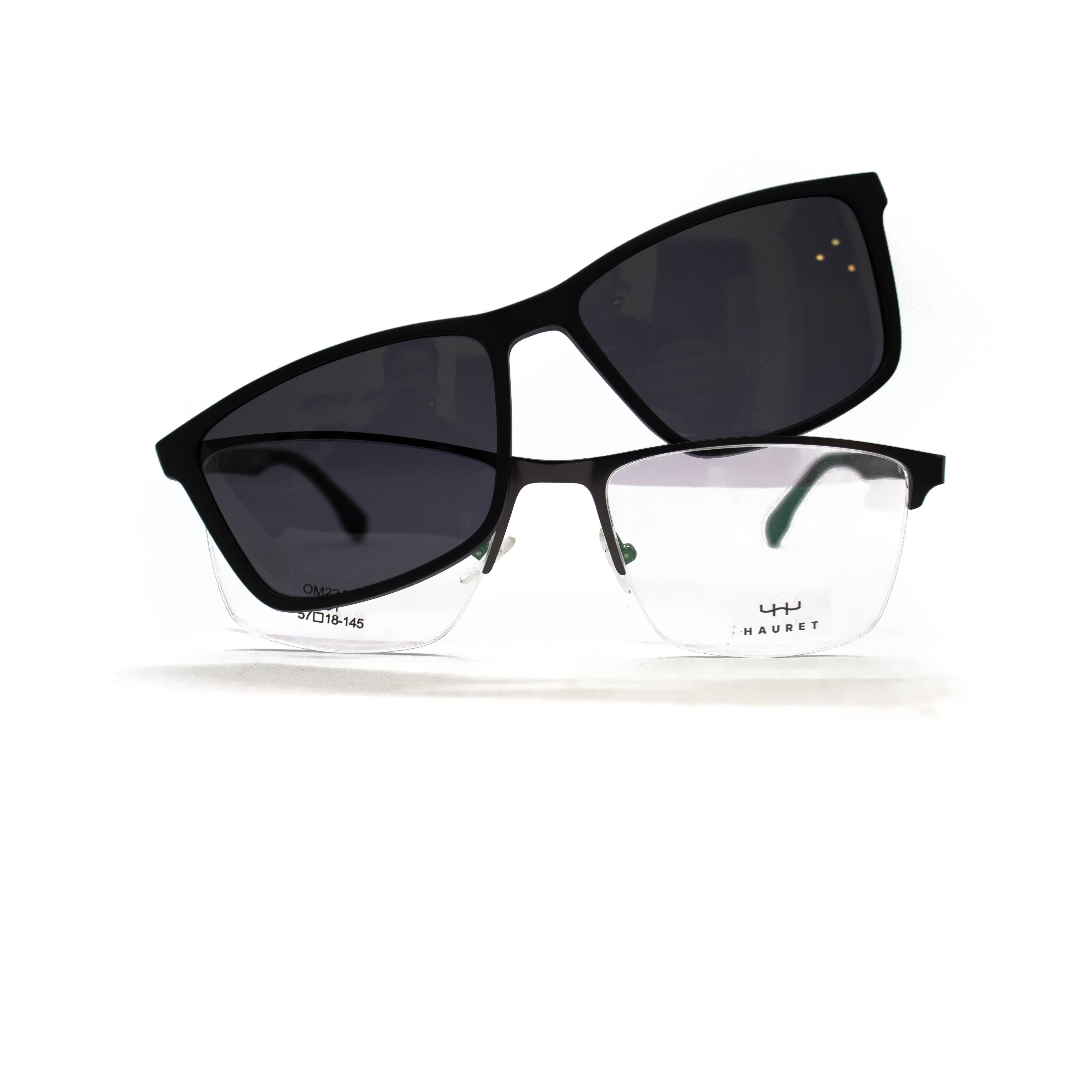 Armação de óculos de grau e de sol fechado em armação no material de metal.