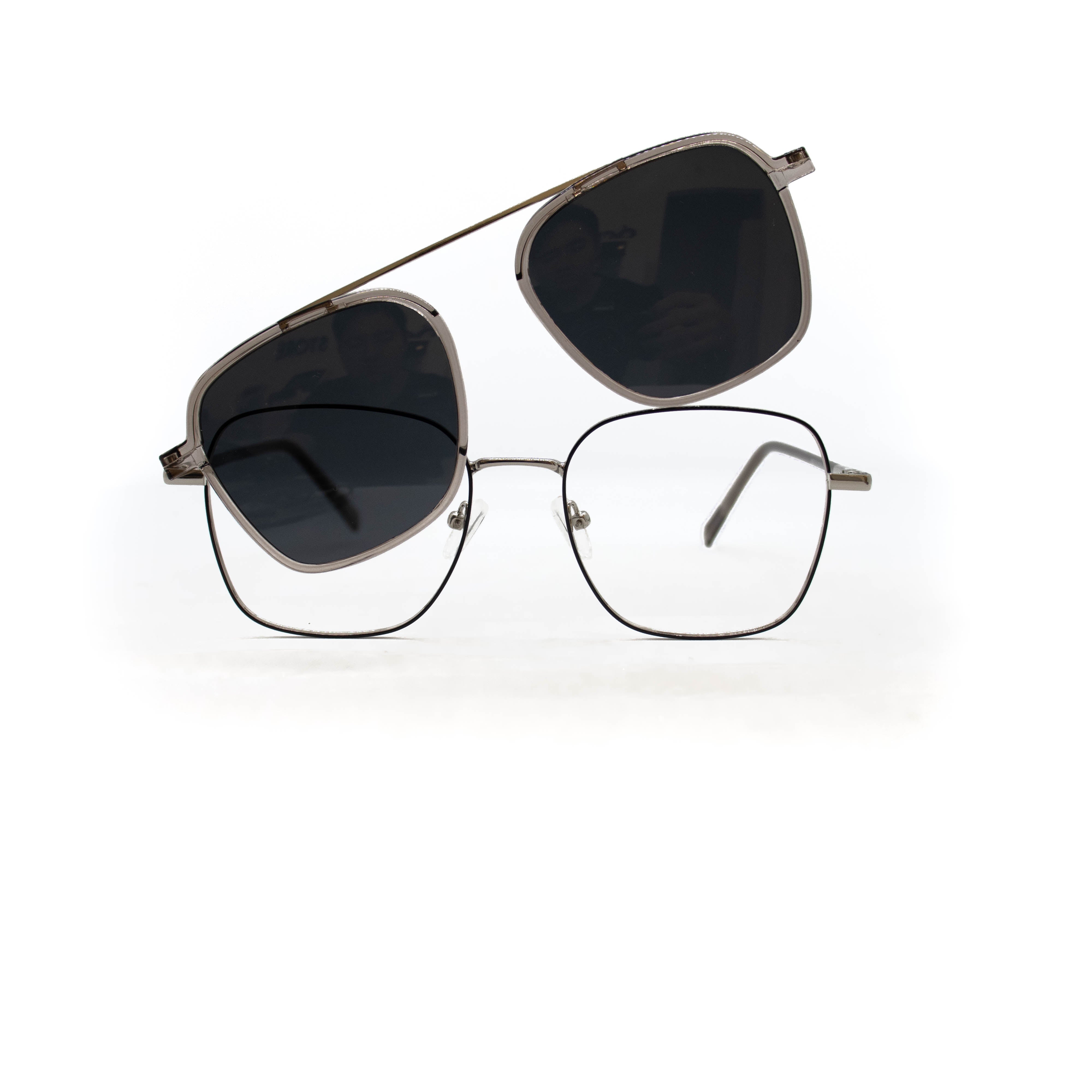 Armação de óculos de grau e de sol fechado em armação no material de metal.