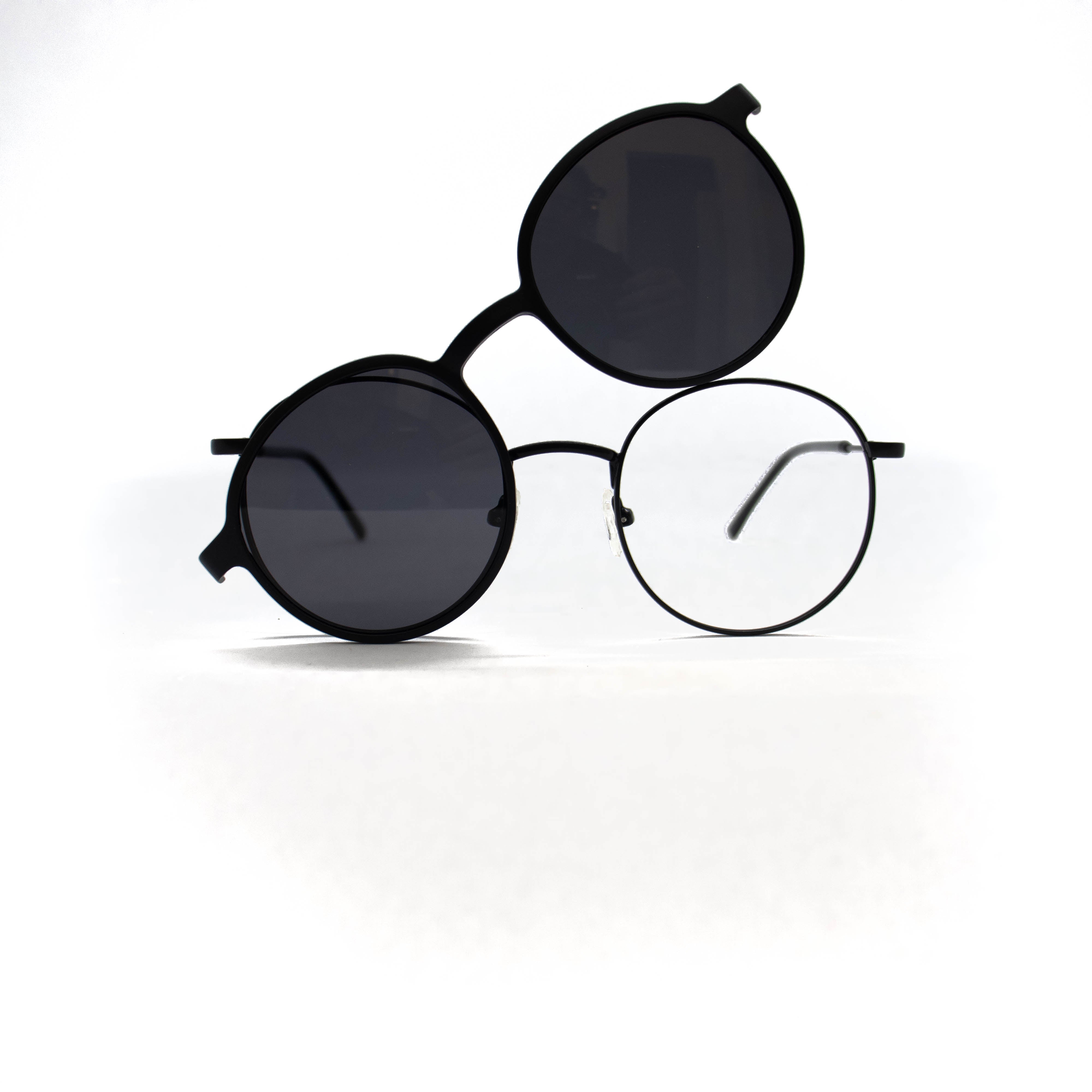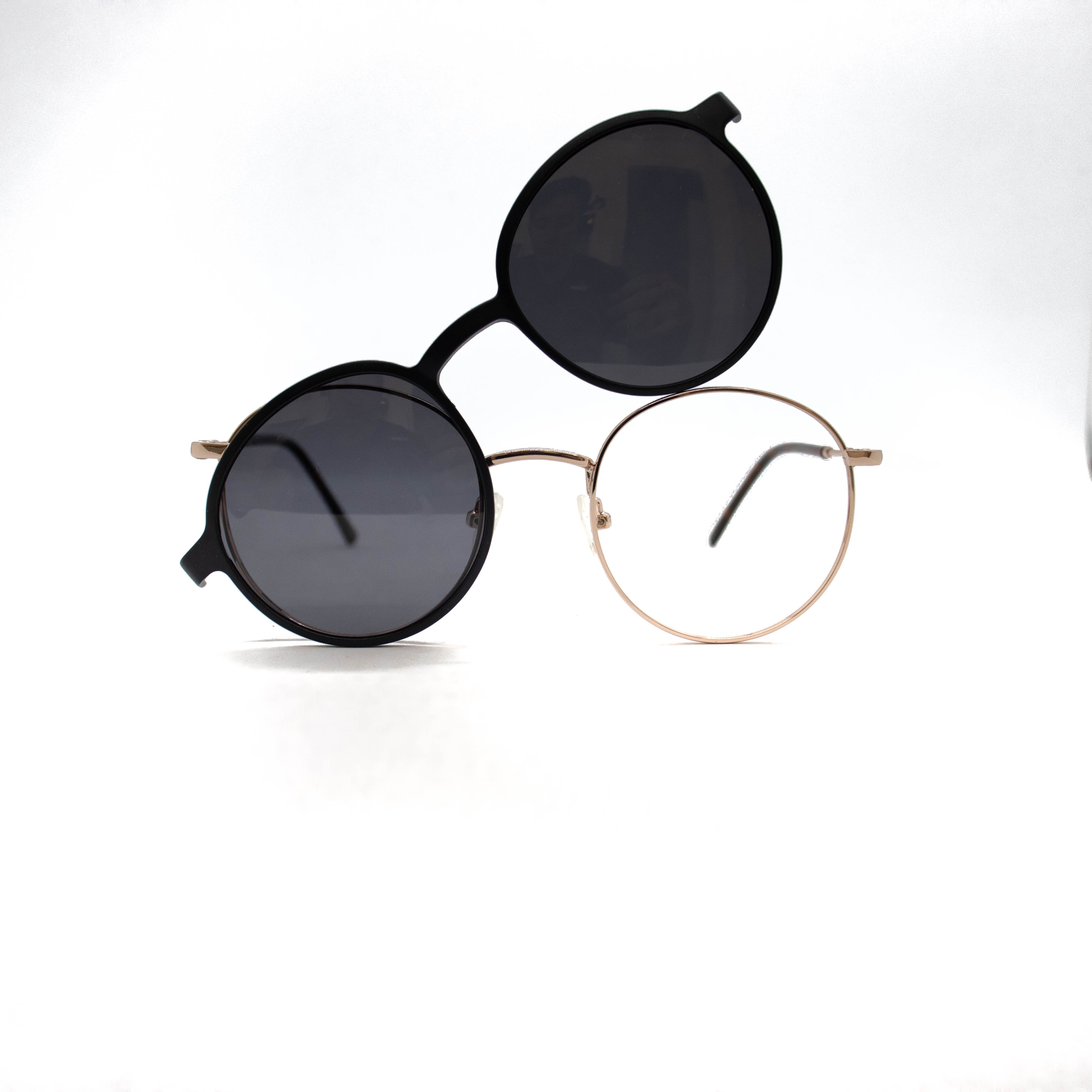 Armação de óculos de grau e de sol fechado em armação no material de metal.