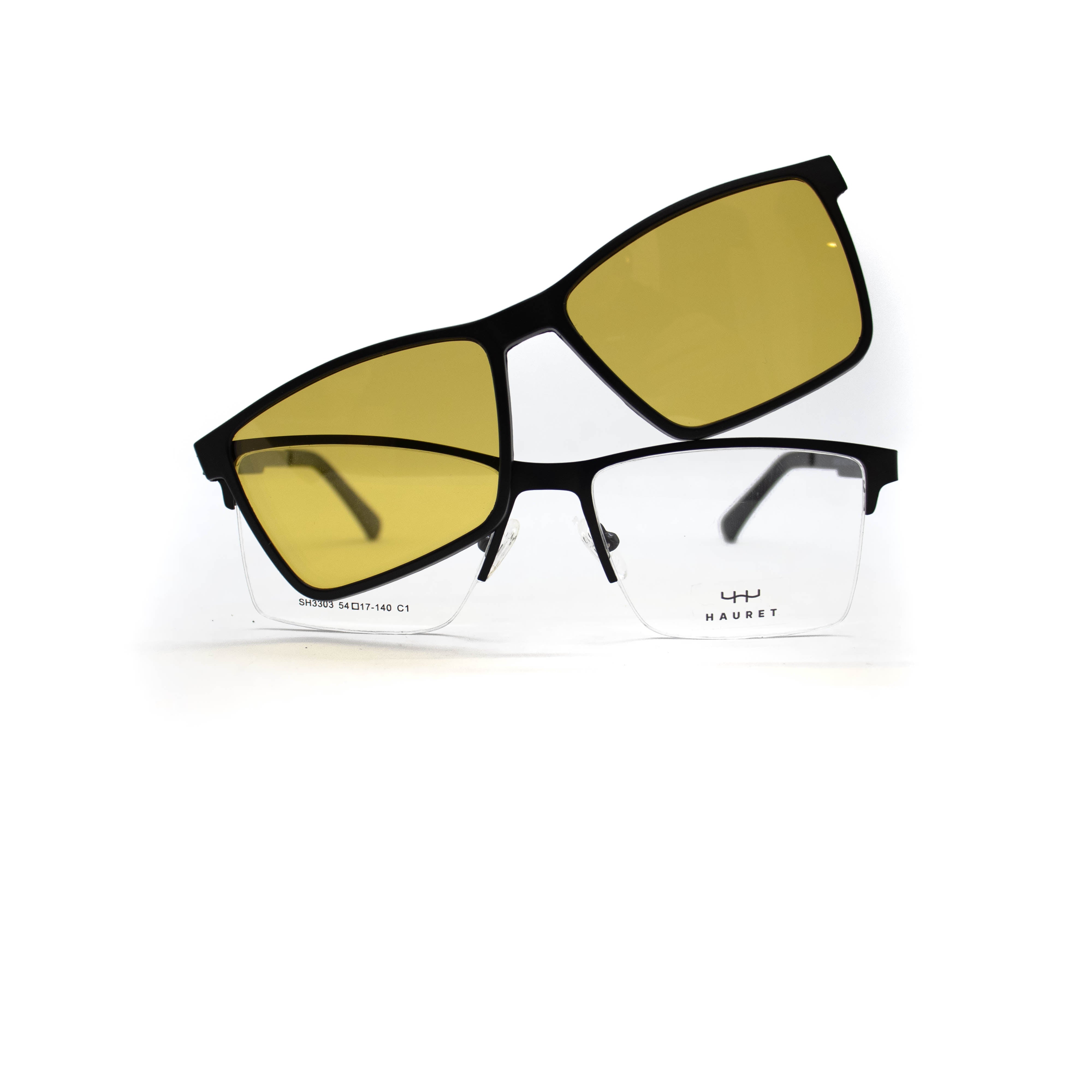 Armação de óculos de grau e de sol fechado em armação no material de metal.